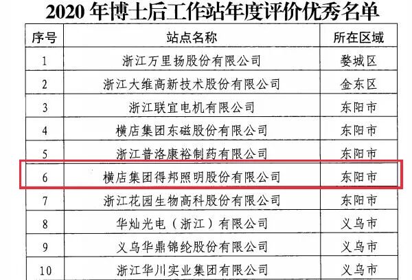 近日,据金华市人力资源和社会保障局获悉,在金华市2020年博士后工作站年度评价优秀的23家企业名单中,横店集团得邦照明股份有限公司榜上有名。